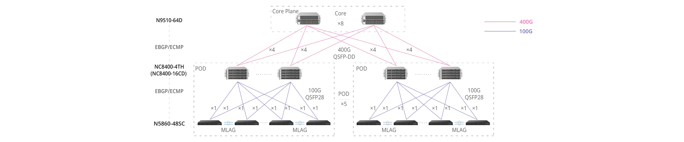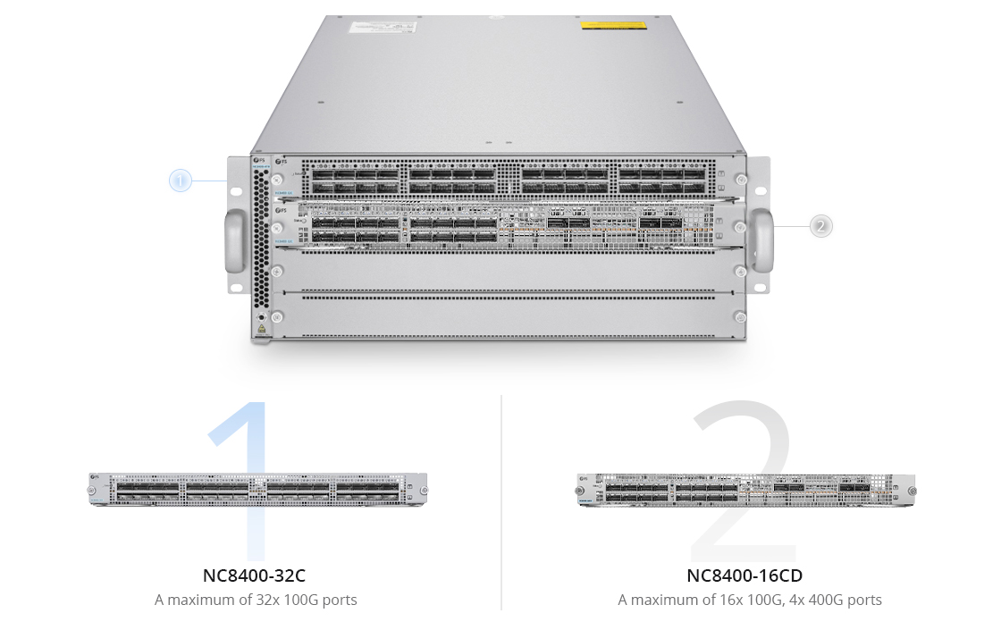 C8400-4TH anahtarı, NC8400-32C ve NC8400-16CD’nin esnek hat kartı kombinasyonları aracılığıyla maksimum 128x 40G/100G veya 16x 400G yüksek yoğunluklu bağlantı noktalarıyla 64x 40/100G’yi destekler. Büyük veri merkezlerinde, HPC’de, servis sağlayıcılarında ve bulut sağlayıcılarında omurga dağıtımları için idealdir.