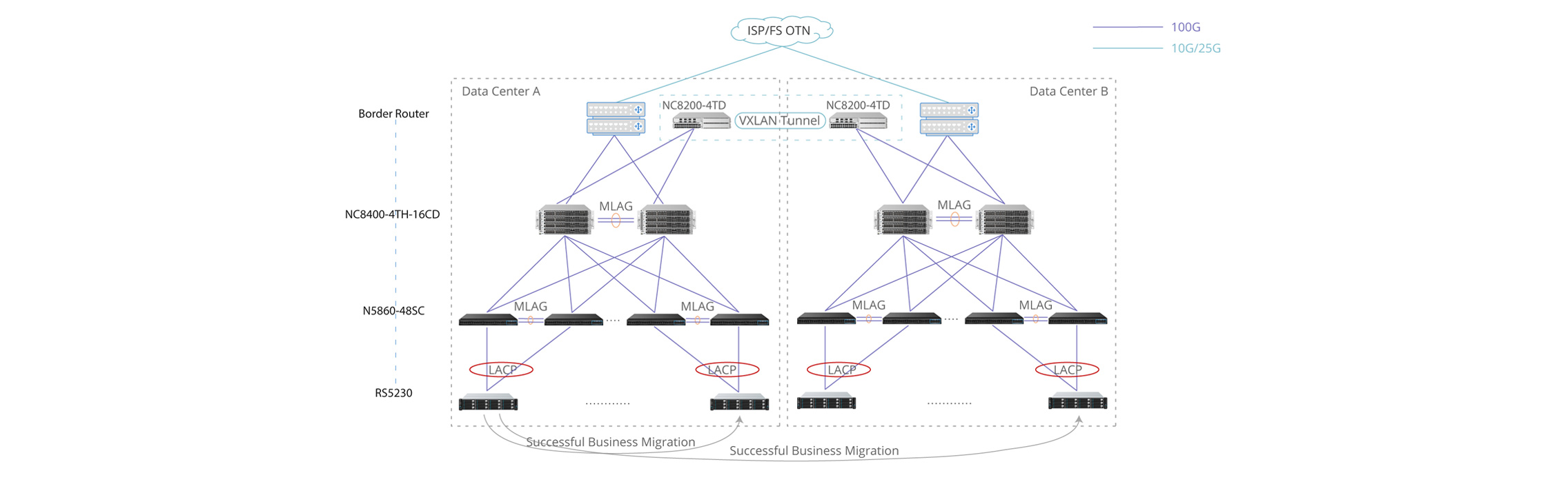 DCI ekipmanı aracılığıyla VxLAN dağıtımı, bölgeler genelindeki veri merkezleri arasında Katman 2 bağlantısı sağlayarak işletmelerin bölgeler arasında esnek dağıtımını ve geçişini mümkün kılar.