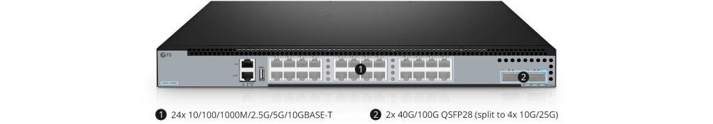 S5850-24XMG, 24x 10/100/1000M/2.5G/5G/10GBASE-T portu ve 2x 100Gb portu ile birleştirilmiş gelişmiş bir donanım tasarımına sahiptir. Bu 10GBASE-T anahtarı, takılı Ethernet kablolaması ve standart RJ-45 konnektörleri ile geriye dönük uyumluluk sunar. Anahtar, geleneksel Katman 2 ve Katman 3 ağları için hızlı servis dağıtımını ve yönetimini kolaylaştırmak için kapsamlı protokoller ve uygulamalarla eksiksiz sistem yazılımıyla birlikte gelir.