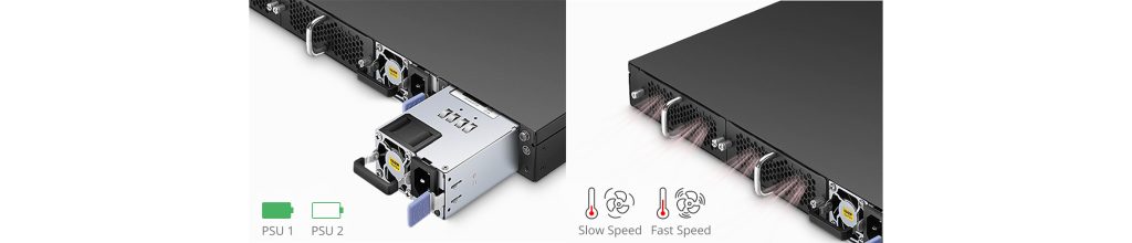 Çift güç kaynakları sistemi kapatmadan değiştirilebilir ve önden arkaya hava akışına sahip değişken hızlı fanlar, güç tüketimini azaltmak için fan hızını otomatik olarak ayarlar.